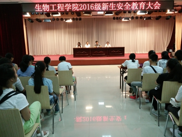 我院历来重视学生安全工作,为使新生有更好的校园生活,生物工程学院于新生报到第一天晚上18:00点在大学生活动中心为全体2016级新生开展了一次安全教育。