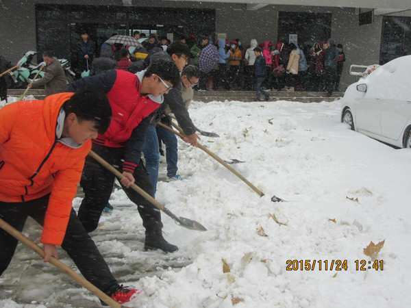 11月23日傍晚郑州市迎来了2015年的第一场雪,24日中午我院志愿者们牺牲自己的休息时间开展了清扫全校区积雪的活动。龙子湖校区的每条道路上都有我院志愿者们奋力清雪的身影。大家不畏严寒,不怕困难,拿起铁锹,铲除厚重的冰雪,经过大家的共同努力,道路上的积雪被清除完毕。给大家提供方便,为全校师生送去了温暖。