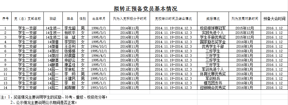 现将14名预备党员的基本情况公布如下: