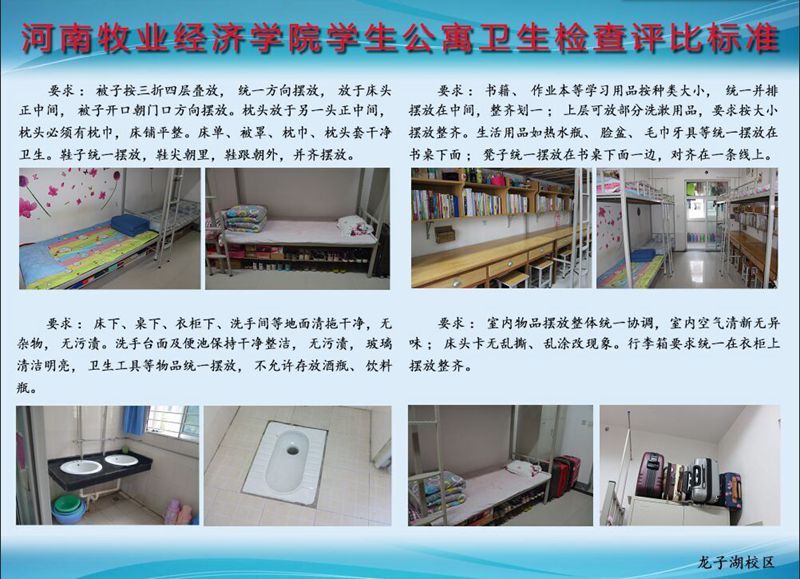 检查范围:宿舍内的地面、阳台、床铺、物品摆放、整体效果及违规违章现象等。